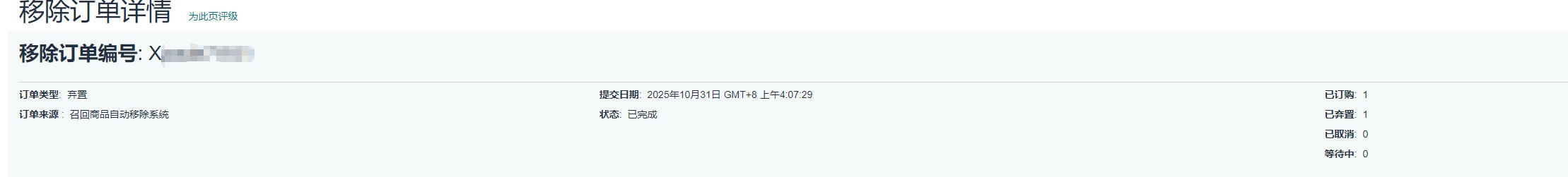 大家收到这样的邮件不要慌。我核实后发现,这属于因二手评级转售或部分库存出现残损而发出的移除通知。近几个月我们也收到过几次,我在查看移除订单时,发现有一个移除订单,来源显示为“召回商品自动移除系统”,与此前收到的邮件相吻合。其他的应该是每月定期移除的一部分,也是在被移除的库存中,数量通常为1件或2件。