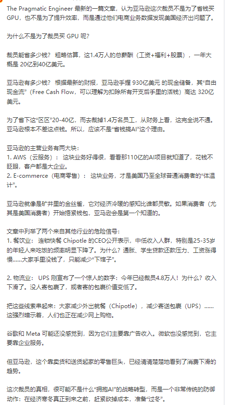 第二个背景就是,之前我刷到过一个关于亚马逊裁员风波的讨论,是一位美国的海外博主写的深度分析。当时其实想引用那篇文章,结合自己的想法跟大家聊聊,但考虑到可能会影响大家的信心,就暂时没提。