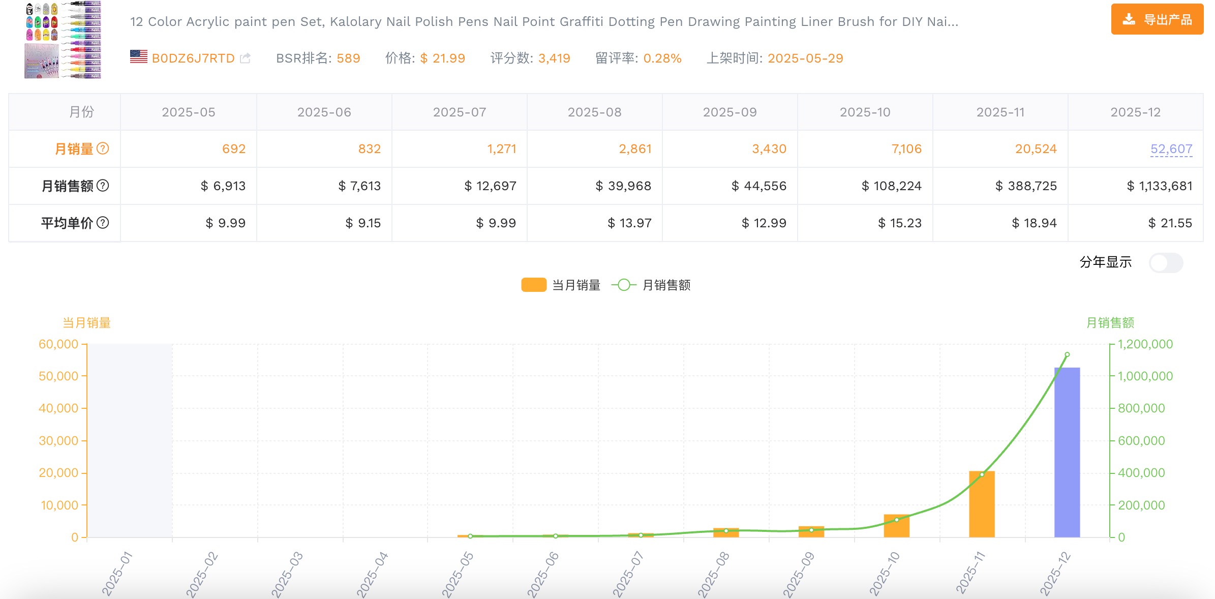 3. 头部链接(就是排名第二的那个 FBA,上架半年的真实卖家),这两个月也涨幅惊人。