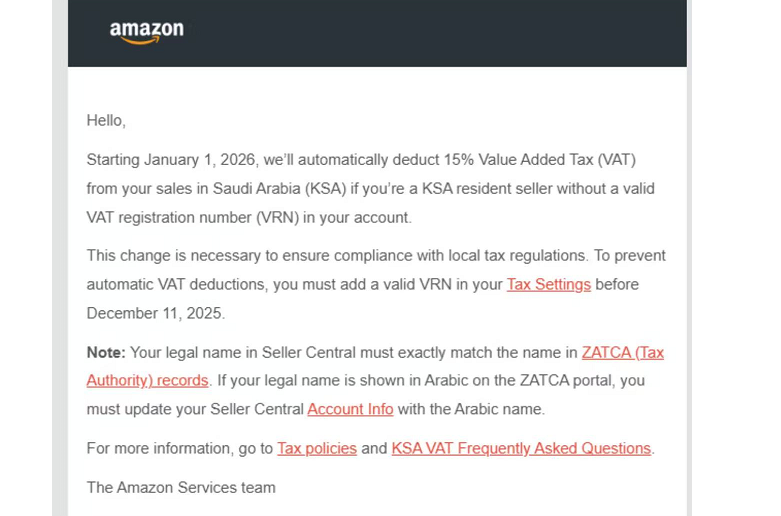 核心变化:从 2026 年起,未提供有效沙特 VAT 税号的卖家,其平台将被强制扣缴 15% VAT。