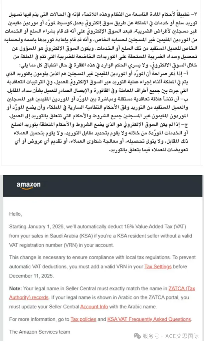 概括来说:如果 沙特本地卖家 没有在店铺中登记有效的沙特 VAT 税号,平台(如 Amazon.sa)将直接从卖家的销售收入中自动扣除 15% VAT 并代缴给税局。