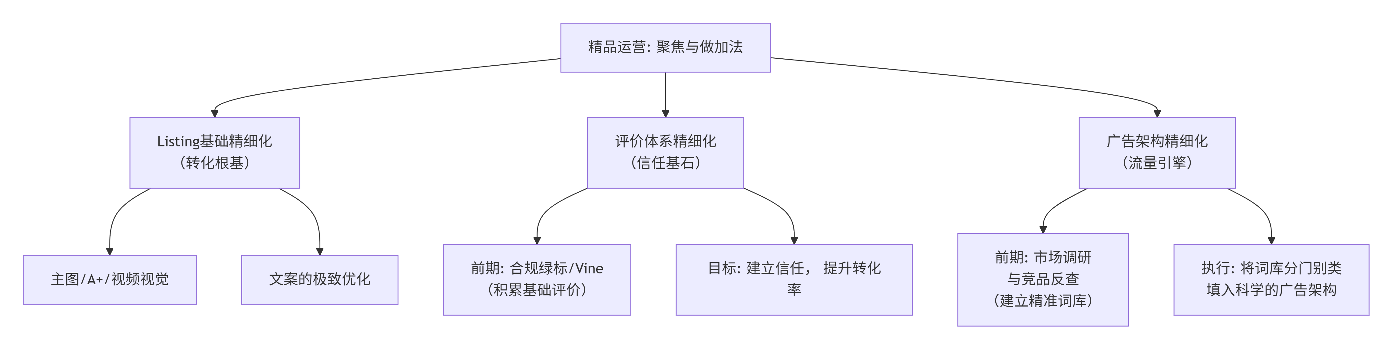 当然,标品也可以用精铺的方式操作,只是“力度”不同。这就回到我前面打的比方:如果把Listing基础做到10分视为满分,精品的目标可能是8-10分,而精铺能做到5-7分就已经算不错了——这不是能力问题,而是模式与资源分配决定的必然结果。