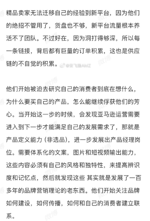 周六呢,去公司加了个班,自己静心沉淀了一整天——研究类目、分析BSR榜单、规划接下来的运营策略,又刷了会儿微博,看到云飞扬大佬前段时间的一篇分析,觉得非常有真知灼见。