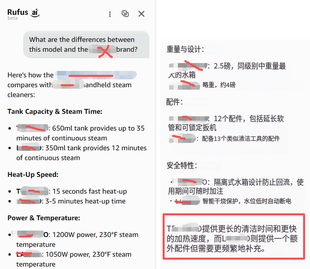 Rufus 会结合产品基本信息对两个品牌进行对比,并总结。如果你能根据这些问题,请在文案中突出强调,这是打造差异化卖点最直接的思路。