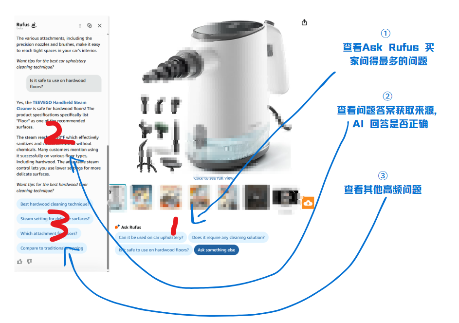 打开 Listing,能看到主图下的“Ask Rufus”,这里会显示 3 条买家高频/最关心的问题。