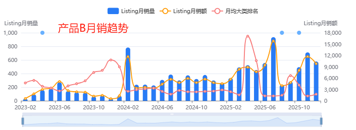 那段时间的核心工作就是清库存、优化Listing,再从现有老品里筛选有潜力的产品重新推广。毕竟没有新品支持,只能在老品里“挖宝”。没想到这番摸爬滚打真的有了收获:一款沉寂了一年的产品A,在我精细化运营下成功“复活”,销量一路攀升,最终成了现在的小爆品(见图2)。产品B也一样(如图3),从当初的半死不活到现在的头部前三。其他产品也是能盘活的全力优化,实在没潜力的就清货下架。