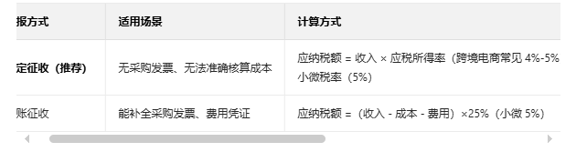 AI给的报税方案是【核定征收】,这个方式可行吗?因为目前找到的很多案例还是涉及一般纳税人,不知道我们这种销售额很少的卖家能否适用【核定征收】的报税方式?