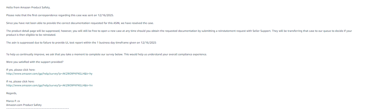 第二天,我们的链接直接下架,并且收到了第二封邮件,称我们未在24小时内提供 UL 报告,因此再次下架: