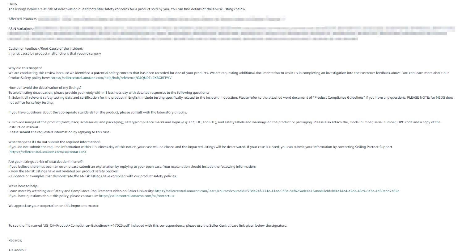 我们主营鞋服类,一条链接在17号收到了来自亚马逊的一封邮件。邮件称有客户穿着我们的产品之后受伤,需要做手术,因此怀疑我们的产品存在安全问题,并要求我们提供安全认证证书。