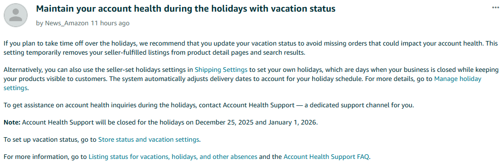 简单来说,这项更新直接解决了 FBM 卖家长久以来的一个痛点:如何在休假期间,既不发货,又不断掉店铺的流量和权重。
