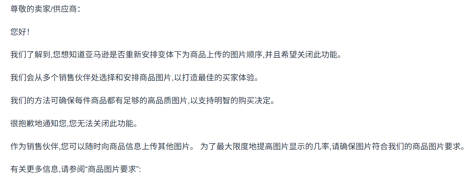 另外我也去开了case去确认。得到的回复是,系统会自主安排图片的顺序,且卖家无法更改。下面附图case回复。