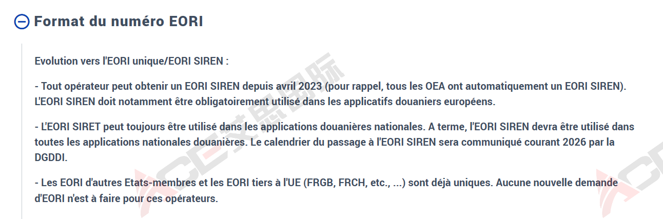 这意味着未基于 SIREN 申请的 EORI,存在在 2026 年后逐步失效的风险,海关系统将逐步只识别 SIREN 级别的企业主体,清关、转关、授权等操作可能因 EORI 不被系统识别而受阻。