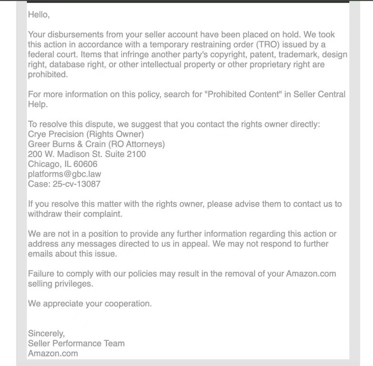 11 月 21 号那天,我正在仓库核对库存,手机突然弹出亚马逊的通知,点开一看,脑子 “嗡” 的一下就炸了 ——GBC 律所发的 TRO 绩效,案件号 25-cv-13087,我那个做了五六年的老店铺,直接被冻结了 4.7 万多美金!​