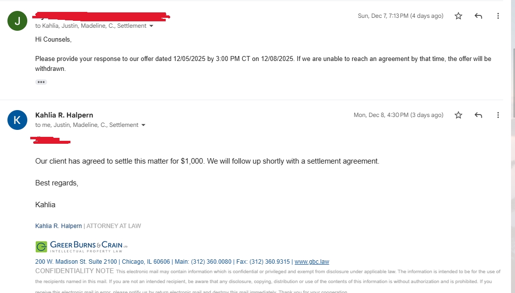 11 月 27 号,我实在没办法了,抱着 “死马当活马医” 的心态,跟那个说 “应诉和解” 的服务商签了协议,交了点预付金。28 号他们律师团队就开始准备资料了,谁知道刚提交没两天就赶上感恩节,只能等着,那几天我真是坐立不安,一会儿怕对方狮子大开口,一会儿怕服务商不靠谱,甚至想过要是和解金太高,干脆把店铺弃了算了。​