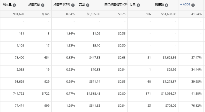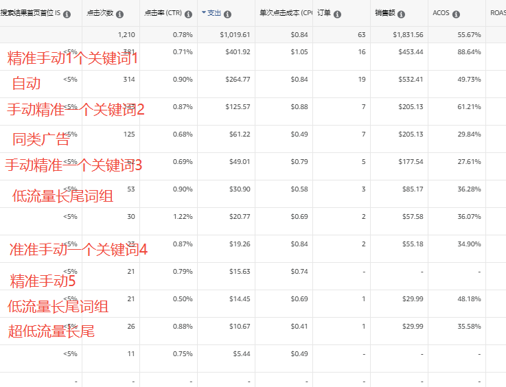 七天的广告数据,第一个精准手动广告,时好时坏的,是个大词,转化率低的离谱,有时候一下一天花费三四十出个五六单,插件数据显示该关键词转化率平均15%,目前这个词自然排名在3-4页徘徊,手动2是一个非常精准的长尾词,自然排名稳定在第二页,插件显示这个关键词转化率有22%,同类广告竞价给高了acos就很高,所以一直都是0.3-0.5在跑,长尾精准广告竞价尝试过给很高达到第一页但是转化率很离谱,一天预算30左右才出一单,所以后面也是没有去冲了,跑到第一页竞价只需要1.3-1.5的样子,
