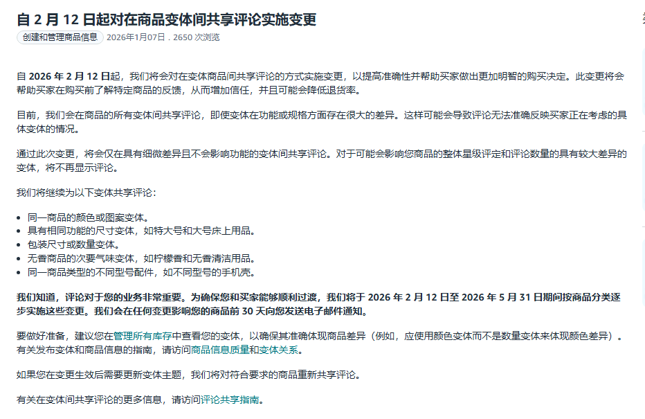 亚马逊更新了变体政策,并明确表示将在 2.12–5.31 期间按类目逐步检查变体合规性。