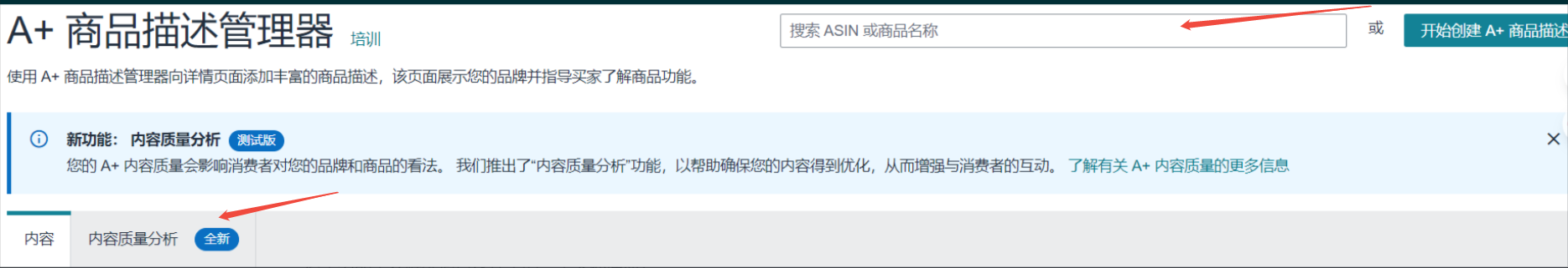 路径:登录卖家后台 → 点击 A + 商品描述管理器 → 选择对应 ASIN → 找到「内容质量分析」标签,点进去就能看详细分析界面。