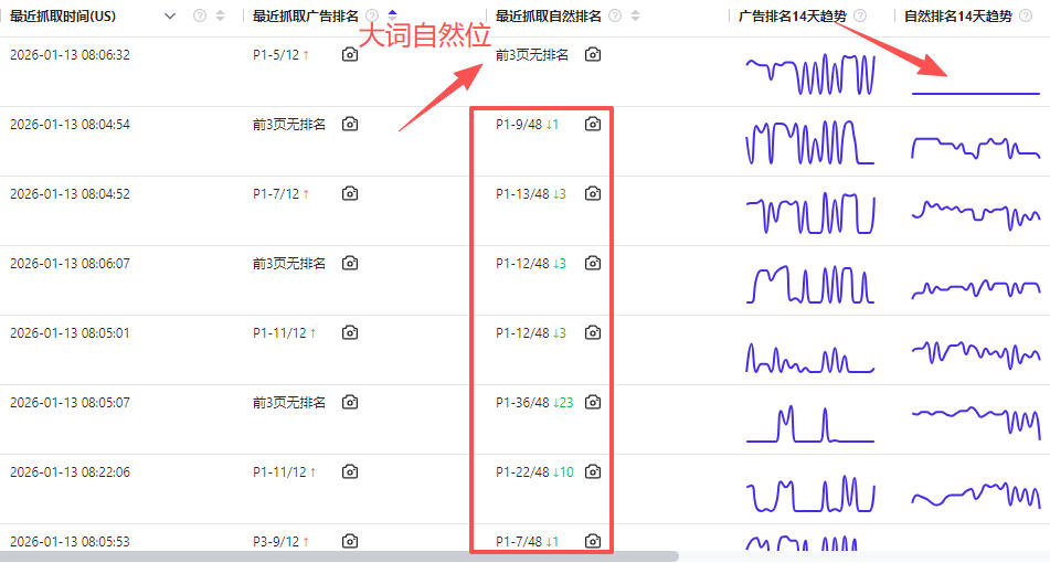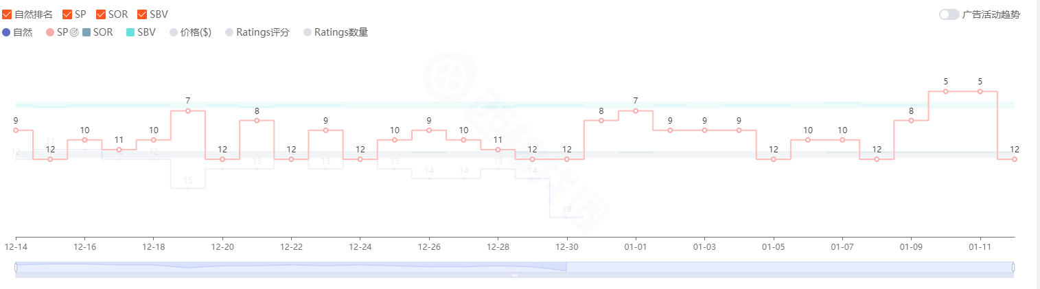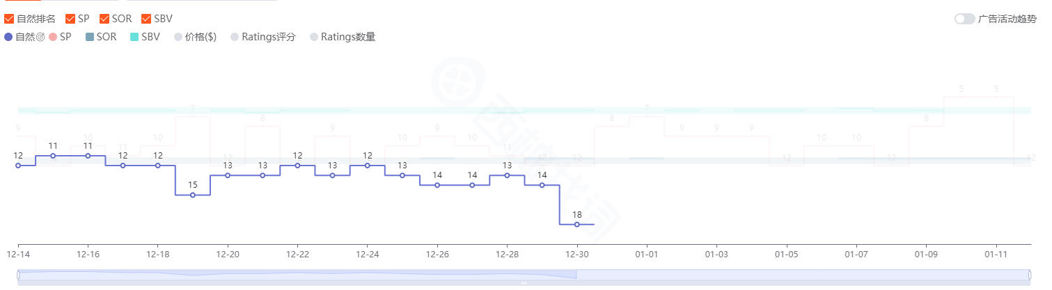 以上是插件抓取的该大词的自然位,可以发现从12月30号开始自然位断崖式消失,从此再也没有自然位。在此之前该关键词排名很靠前,链接在小类前5,销量很靠前,不至于核心大词自然位从第一页前面直接消失不见。