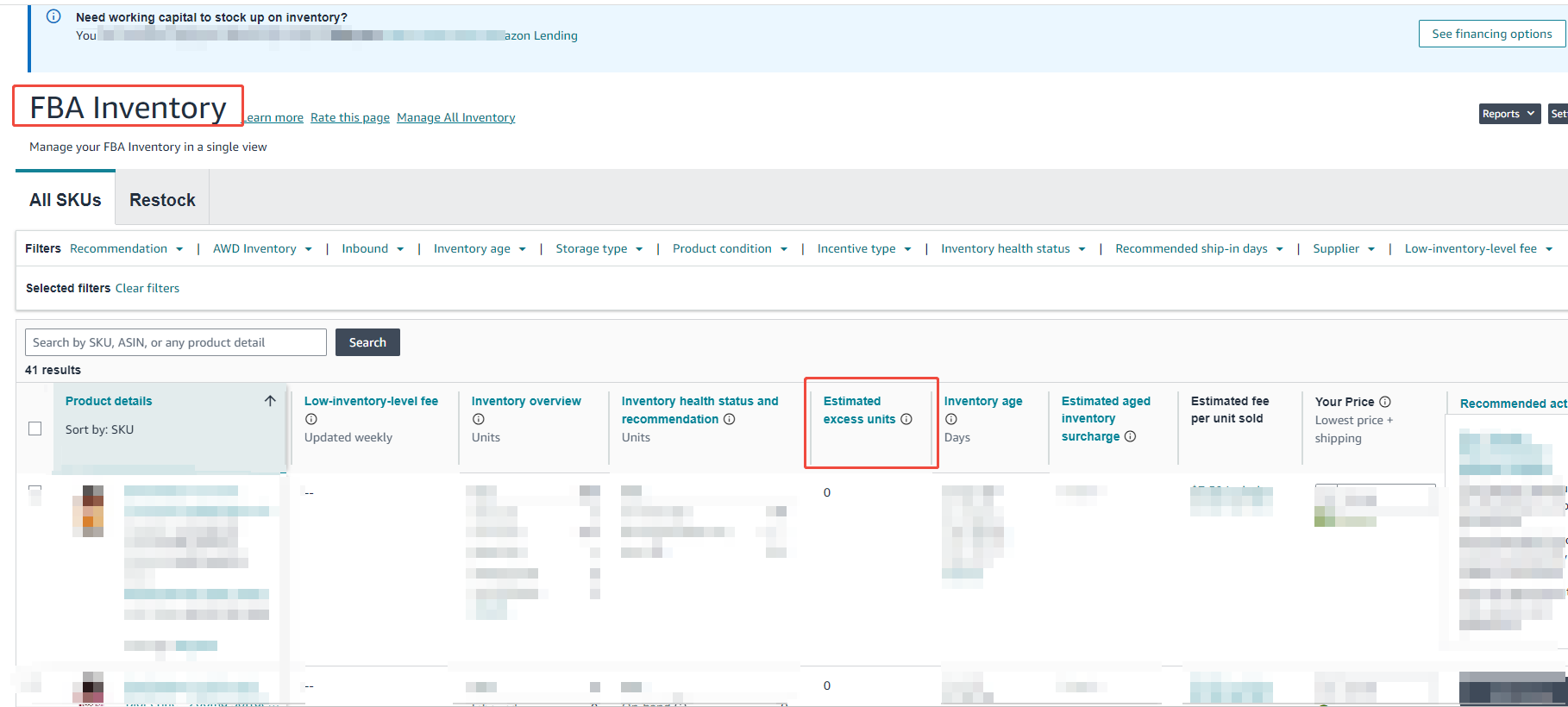 卖家可通过后台的 亚马逊物流库存 工具,从 “预计冗余商品数量” 进行排序,筛选出潜在冗余库存,并可在右侧“操作”查看针对每个 ASIN 的建议。
