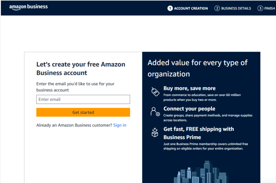 1.  打开 Amazon Business 官网,点击 Create a free account 注册卖家账号,可以用无痕窗口打开。