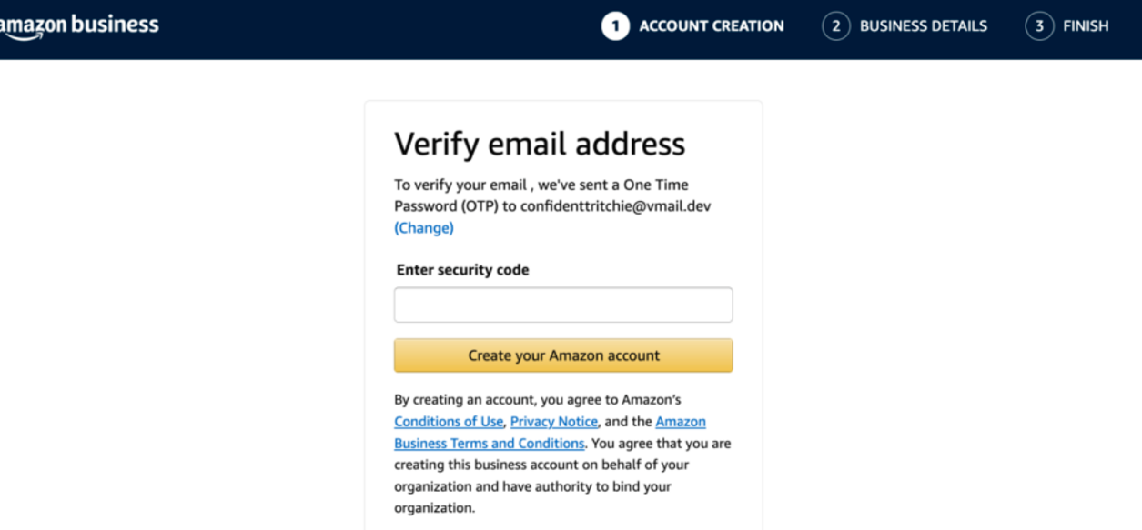 2.  输入亚马逊给邮箱发送的激活码后验证邮箱,无需填写工商信息,点击创建,等待邮件邀请(一般 24 小时内就会收到)。