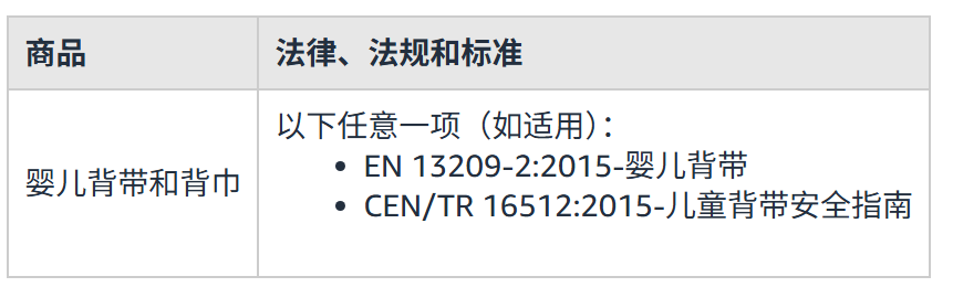 对于亚马逊欧洲站,合规要求相对统一。婴儿背带和背巾均需符合以下两项标准中的任意一项:EN 13209-2:2015 婴儿背带 或 CEN/TR 16512:2015 儿童背带安全指南。