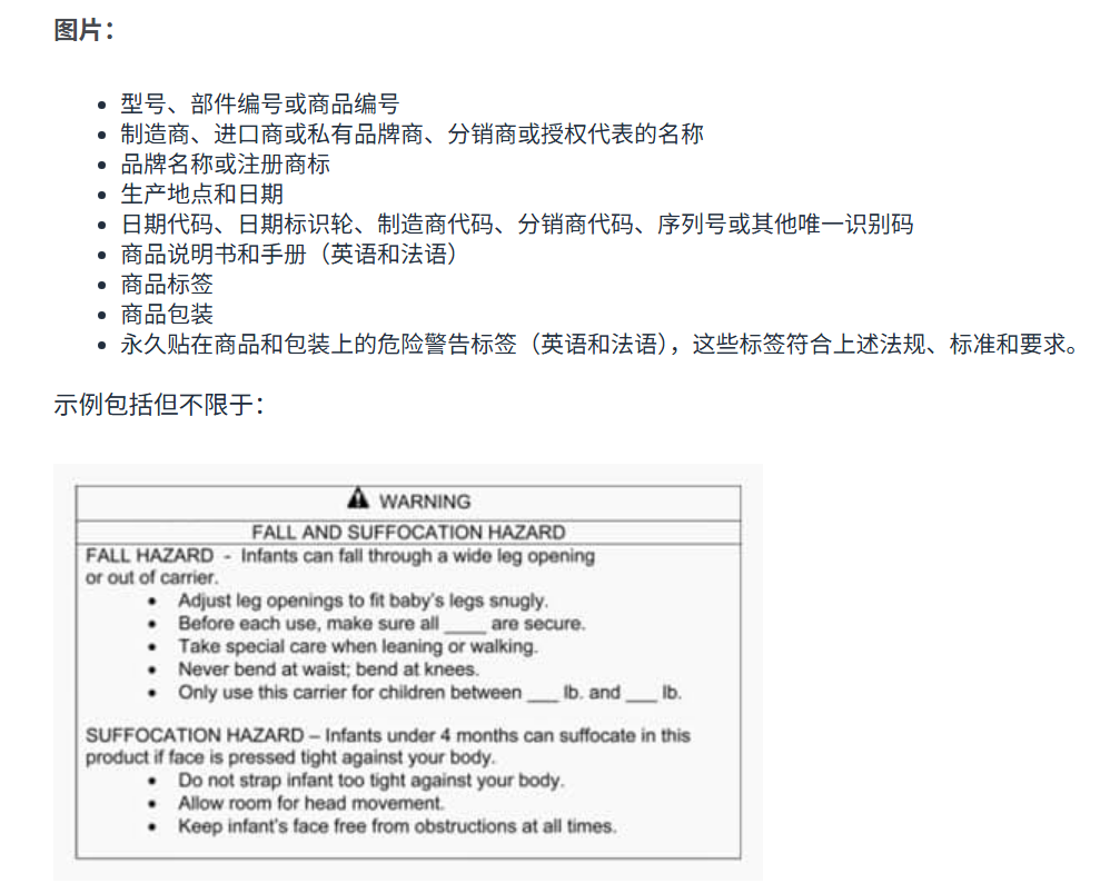 必须包含的图片元素有:型号/部件编号、制造商/进口商的名称地址、品牌名称或注册商标、生产地点和日期、商品说明书、注册卡、商品标签与包装,以及永久粘贴的 CPSA 追踪标签和危险警告标签。