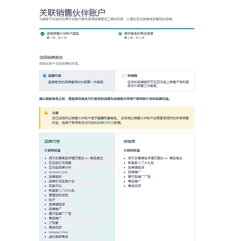 2、如何进行品牌授权?我看到两个页面好像都能操作授权,如下图,【关联销售伙伴账户】和【用户权限】,我应该选哪个?还是两个都要操作?这些选项分别要选哪个?