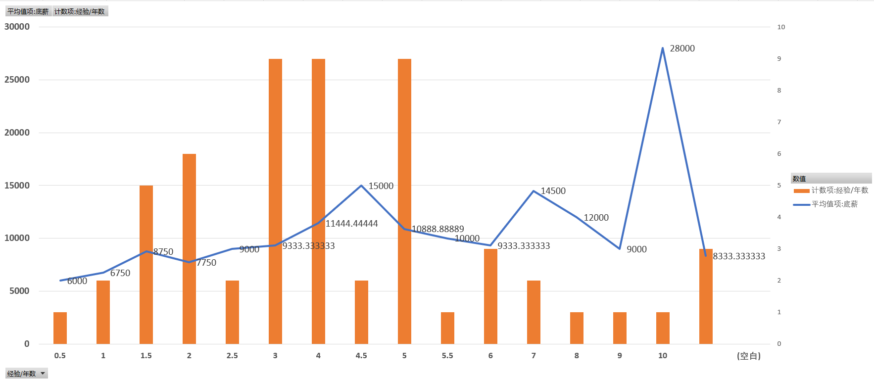 2.折线图为该工龄下的平均工资,纵坐标为左侧数字,单位是人民币