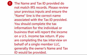 美国本土个人账号,因税务问题想升级为企业账号,公司已经注册下面了,在换税务信息的时候遇到了报错,如下图,请问是哪里有问题呢?公司名字和EIN确认无误!