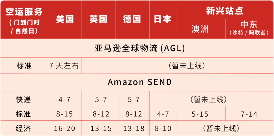 如果您春节期间有快速补货的需求,可以使用AGL或Amazon SEND承运,可以参考以下时效。
