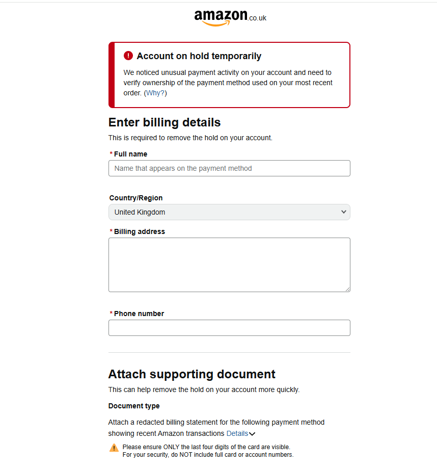 第一天英国站对应的买家号,购买了3张礼品卡,被取消订单,查了一下以为是之前绑定的信用卡过期了更换了新的建行信用卡后,然后第2天再次下单购买了2单礼品卡,2个订单也被取消了;打电话问建行那边说没问题,第三天早上又尝试下了一单,结果发现英国买家号被hold了,感觉天塌了。发现欧洲站的卖家后台无法进去,更严重的是,我美国站后台也没办法进去,我美国站跟欧洲站的资料是2套账号,怎么也登录不上去。一登录后就显示让我提供信用卡账单。(先别骂为啥我用买家号买礼品卡,因为我之前用别的买过几次,没问题,哭....)
