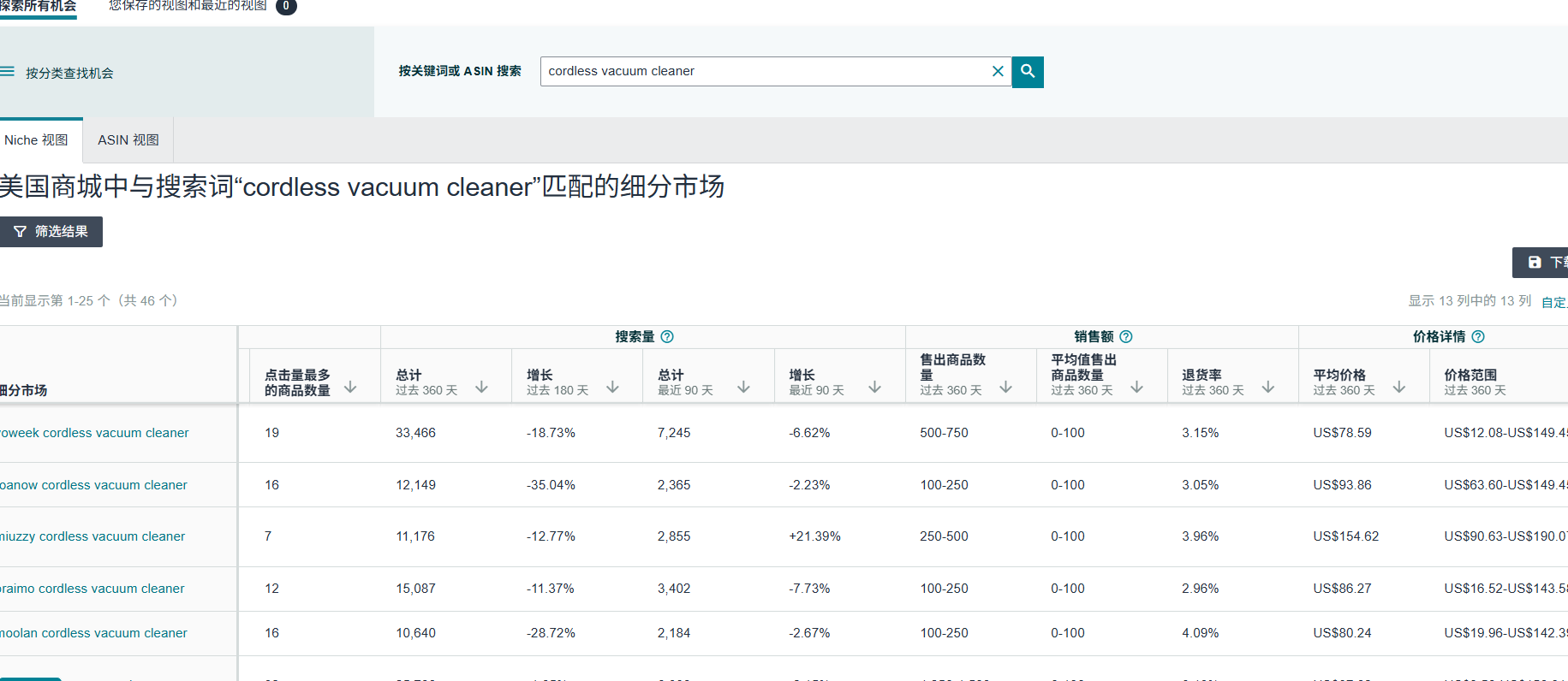 5.关于以上指标中,平均客单价,售出件数,可以通过亚马逊后台商机探测器和选品指南针找到数据,当然如果觉得麻烦,不过度在意数据真实性,只是有数据帮忙判断趋势,节约实际的话,也可以使用第三方工具进行查询,以节约数据寻找时间