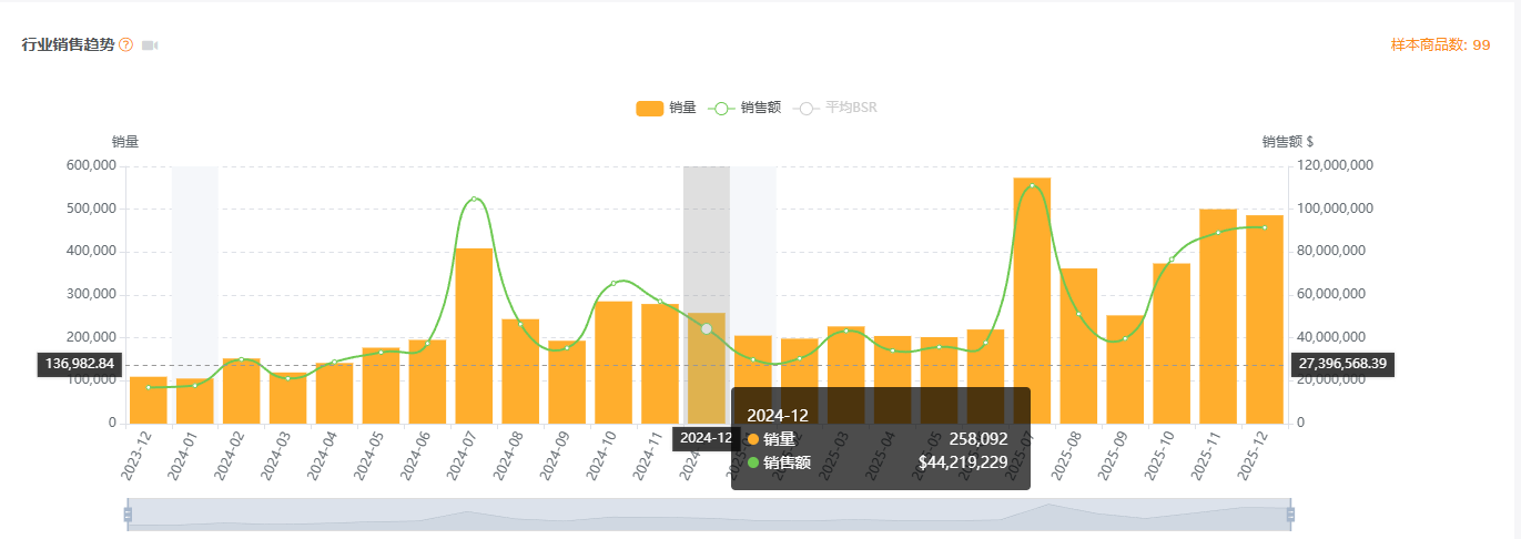 3.总销量与类目容量:监控类目 TOP100 产品的总销量变化,总销量整体走高说明类目整体销量提升,市场需求旺盛;反之则可能需求萎缩。同时结合类目总销售额数据,判断市场容量大小 —— 若销售额持续增长,说明市场仍有增量空间,可加大推广力度;若增长停滞,则需聚焦存量竞争,优化产品核心优势。