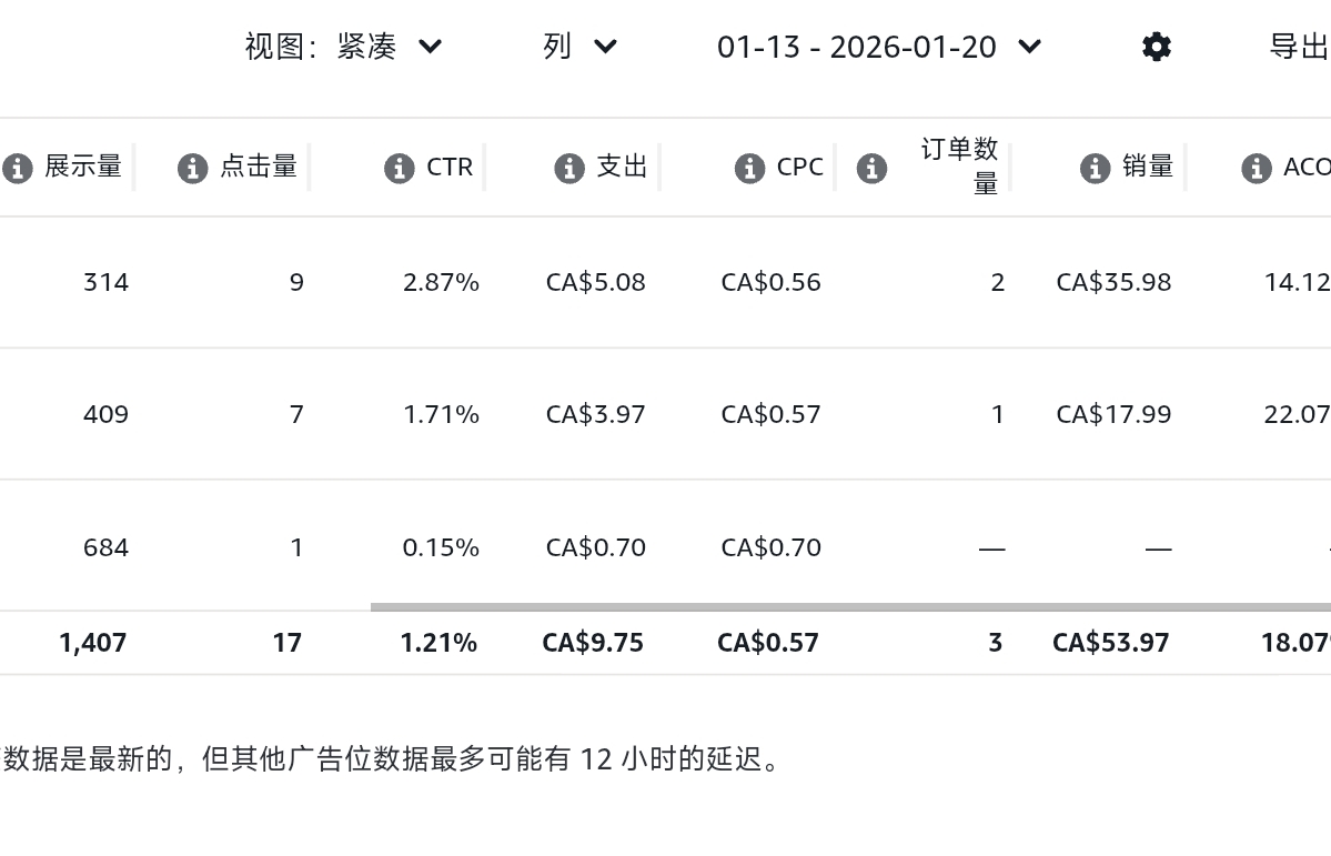 我做的是家居类目,里面一个小小细分版块。做的最好的竞品月销量只有100+,但是对方卖的是25加币,小类排名50上下。其余几个竞品连50+月销都没有,小类排名300开外。我做的产品跟他外观相似,虽然没有品牌做不了A+,但是依靠17元的低价,自动紧密广告+商品定位广告(只定位25加币的竞品),每天都有5单上下,其中自然单占比一半,小类排名一度跟竞品差不多,他的月销50+也消失了,这样的情况大概维持了一周左右,2026.1.13到2025.1.20。