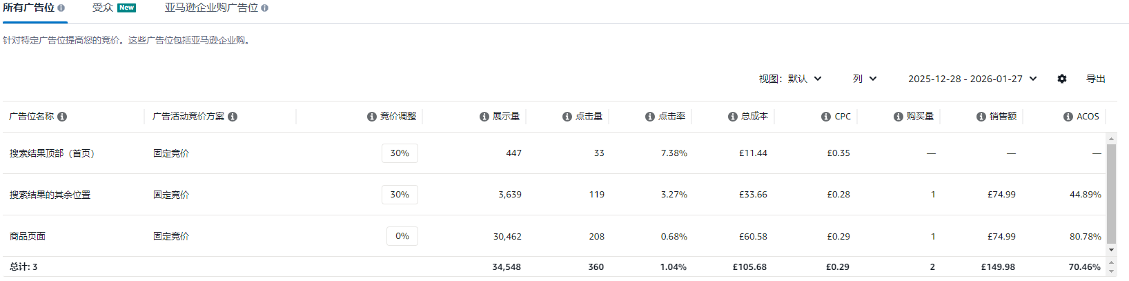 精准组广告的竞价位置如下,Ps:这个类目的cpc就是很低,不是我不愿意给高价。