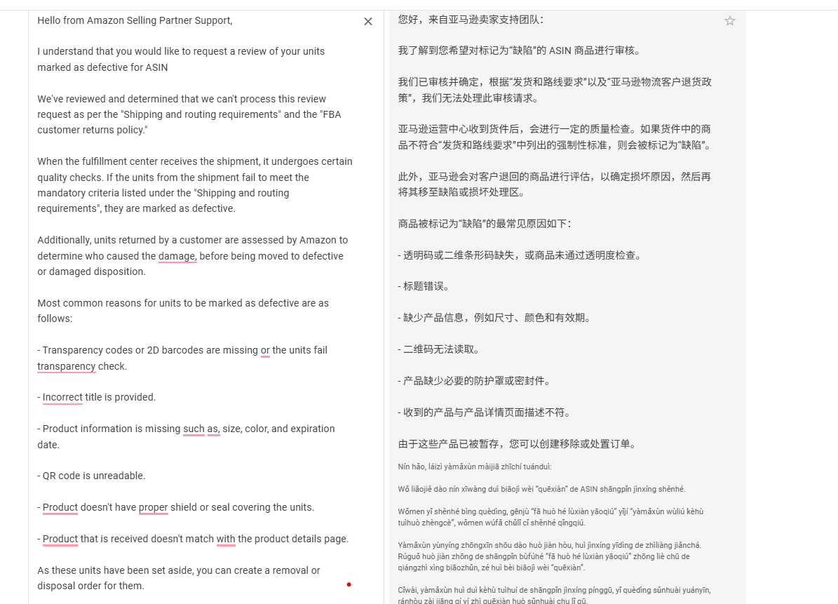 开case问亚马逊客服官方回复说:我了解到您希望对标记为“缺陷”的 ASIN 商品进行审核。