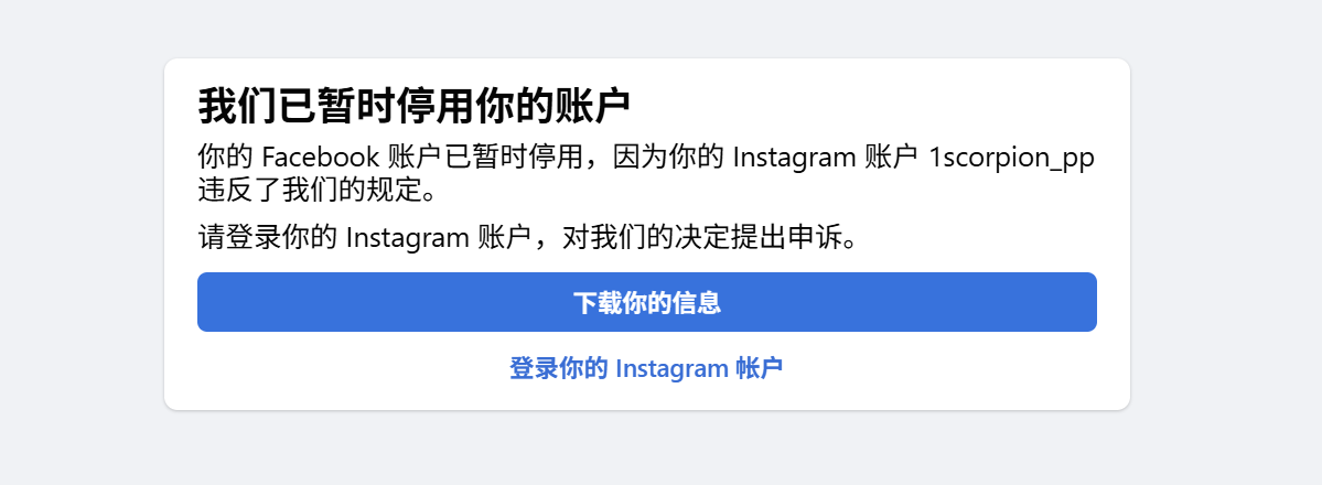 求助!! FB账号关联的IG账号在29号被检测出违规,(实际上这个IG号只是注册好了都没登陆过),连带着FB账号无法登陆,现在是显示账户已暂时停用,说让我去IG申诉,但是IG没有申诉的入口,显示已停用,各位大佬有方法吗,账号已经用了两年多加了好多好友客户