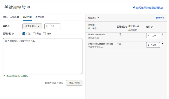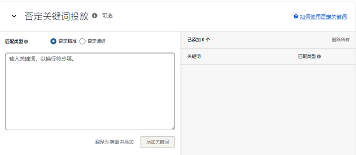 匹配类型:广泛/词组/精准,建议一个广告活动只开一个匹配类型,方便后续调整。