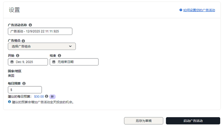 广告活动命名可以和广告组的一致;有广告组合的可以选;重点是设置合理的广告预算。