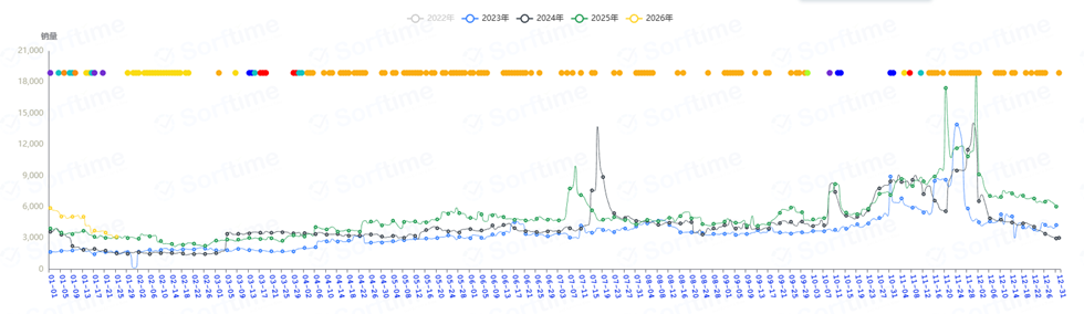 大家看这张图,这是2022年到2025年这4年的月度销量数据,每年的销量曲线都像过山车一样,规律非常明显。