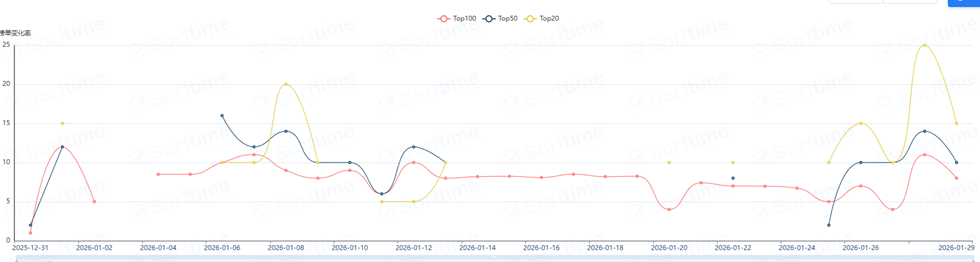 不用怕这个类目被老链接完全固化,看这张新品在榜单的排名变化图。很多新品能快速冲进Top 100甚至Top 20,这说明平台会给新品流量机会,起量速度可以很快。