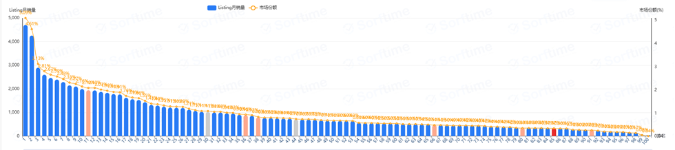 大家看上图,这是头部Listing的月销量与市场份额数据。我们可以看到,排名第一的Listing月销量能达到4000多台,并且前30名都有稳定的销量和市场份额。