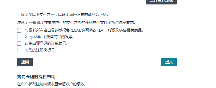 1. 权利所有者出具的授权书 (LOA)/许可协议 (LA),授权您销售相关商品。