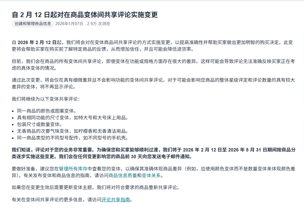 自 2026 年 2 月 12 日起,亚马逊将会对在变体商品间共享评论的方式实施变更,并按产品类别分阶段推进,预计 5 月 31 日前完成全面落地。