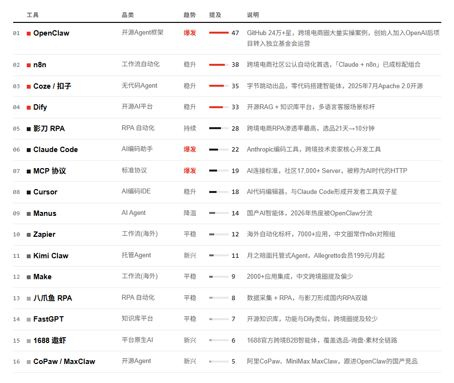 基于知乎、CSDN、53AI、36氪、B站、GitHub 等中文互联网社区,在「跨境电商 + 智能体 / 自动化」话题下的工具提及频次统计。数据截至2026年3月1日