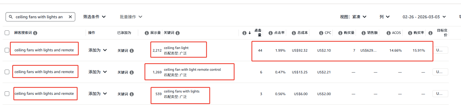 这个是对应的广告后台截图,广告活动为多词单组广告活动。虽然知道点击数量不多,但也能作为思考方向。因为这种情况其实很常见,哪怕是单复数的投放,搜索词是一样的,转化也可能天差地别。还是说其实每个词都好,只要调好对应竞价,就会有好的转化。如果我把该词拉出来打精准,应该给多少的竞价合适