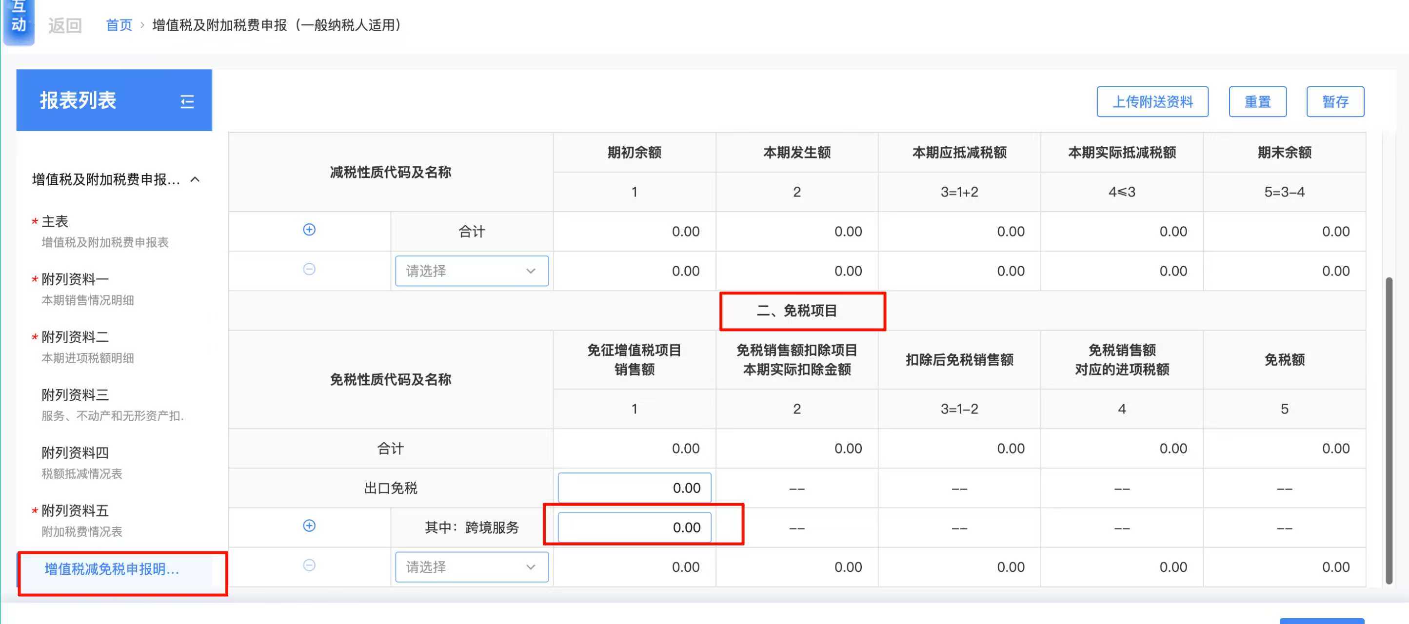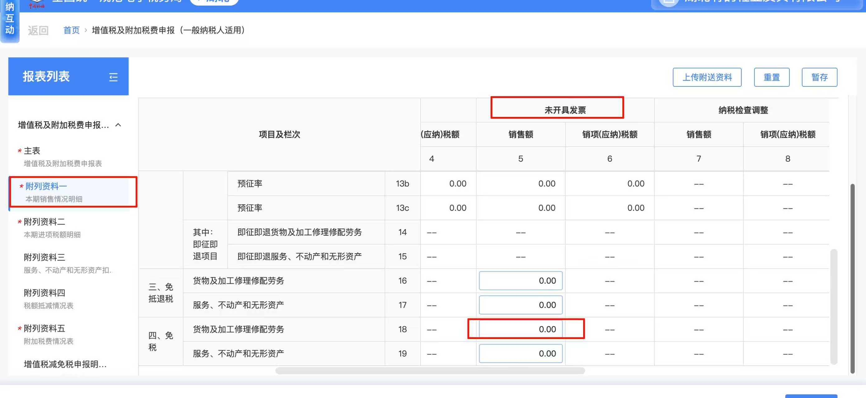 2. 第二个方案就是在电子税务局的附表一的 第18 栏填写免税销售额。然后在免税申报明细也同步填写,如下图(不知道是不是这样填,有知道的大神麻烦告知一下,谢谢了)