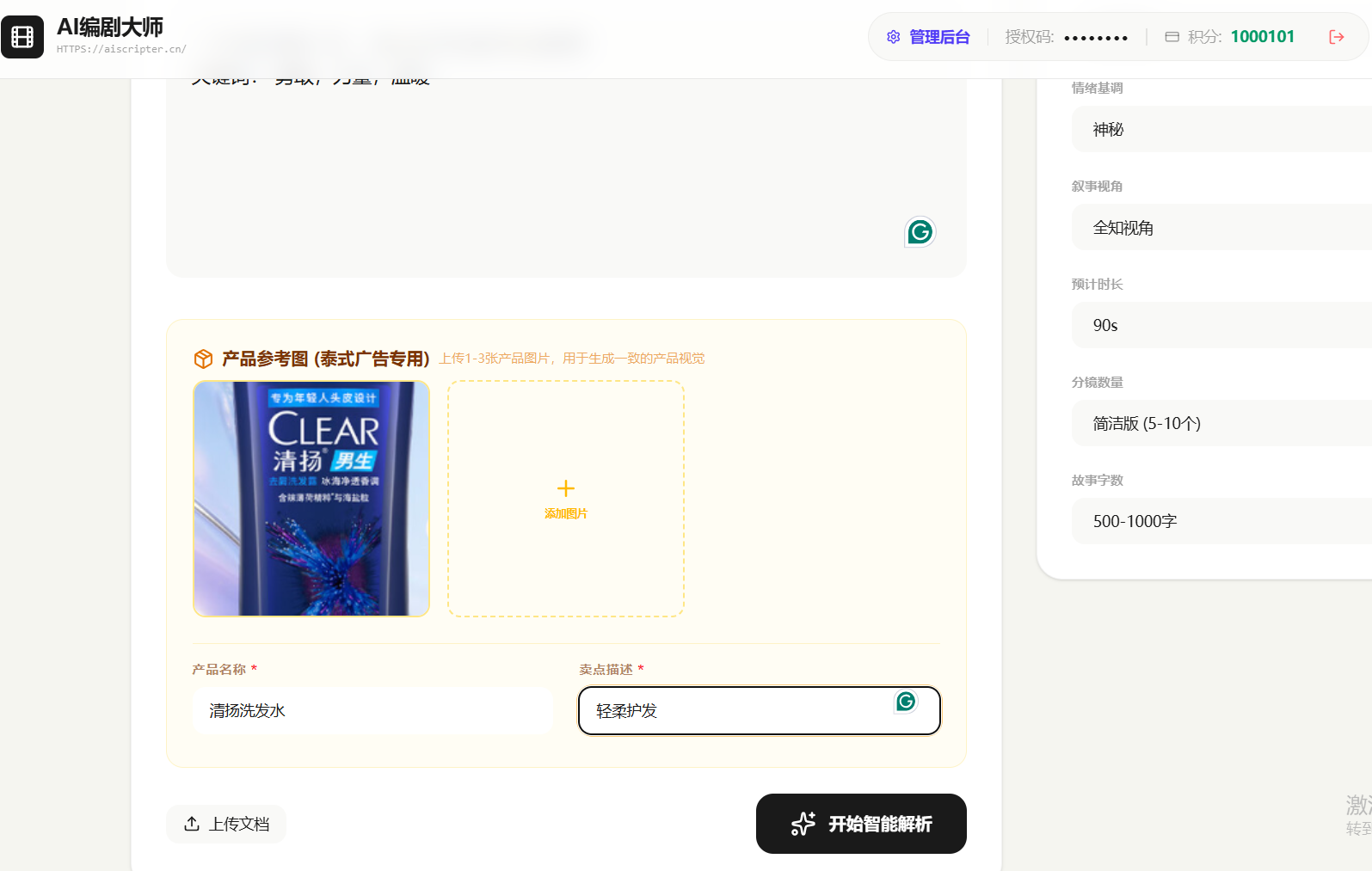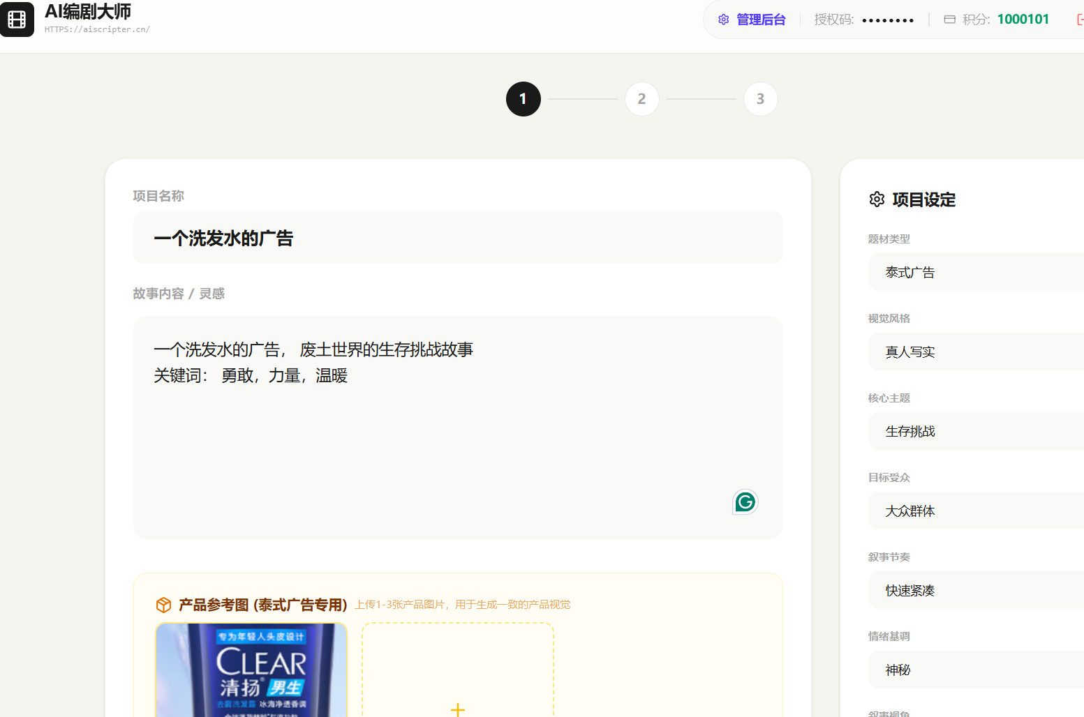 1) 输入剧本名称,大概内容, 如果是选择的泰式广告,则需要上传产品