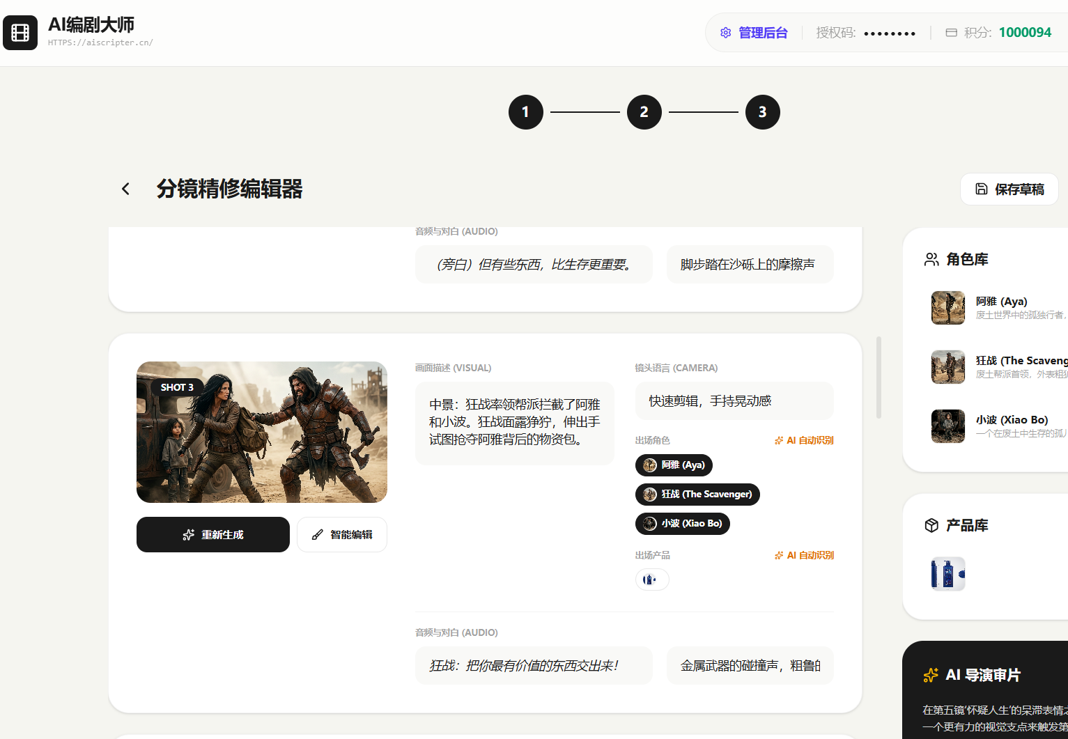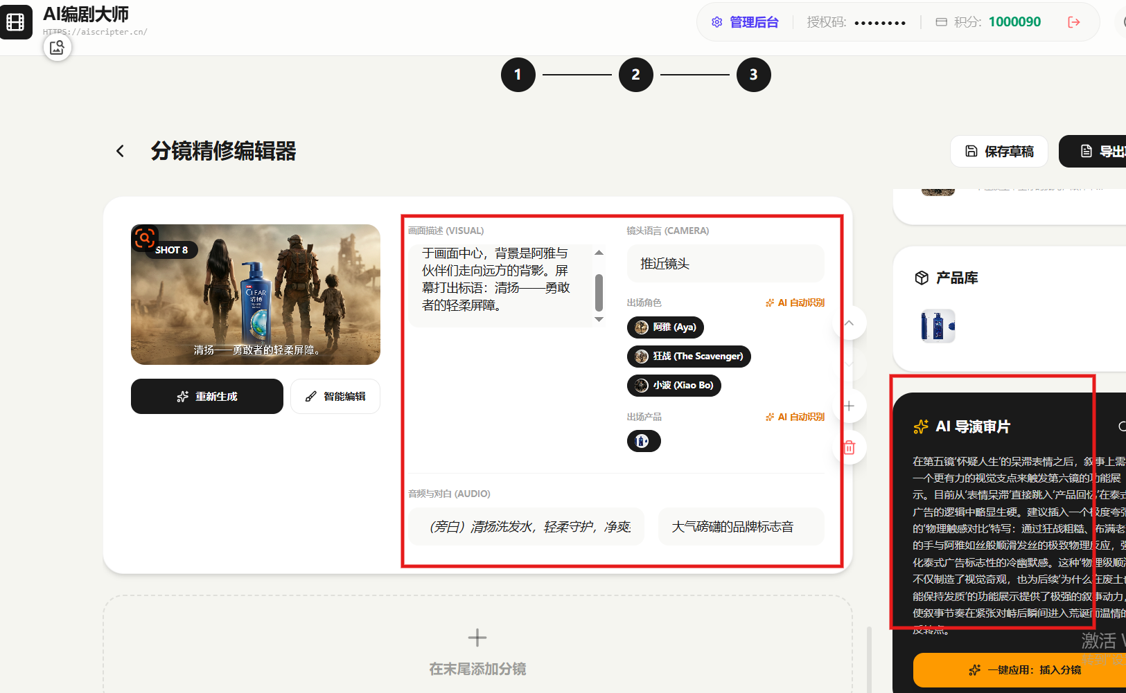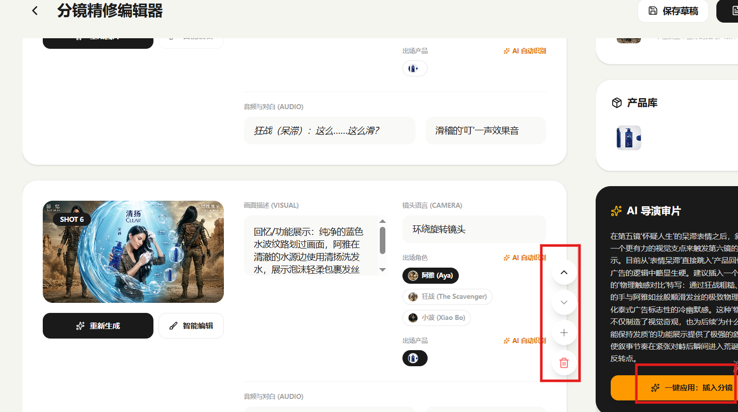 b.  AI 导演审片 也非常强大, 会根据当前剧本剧情,推荐是否插入新的分镜,点机会自动插入新分镜
